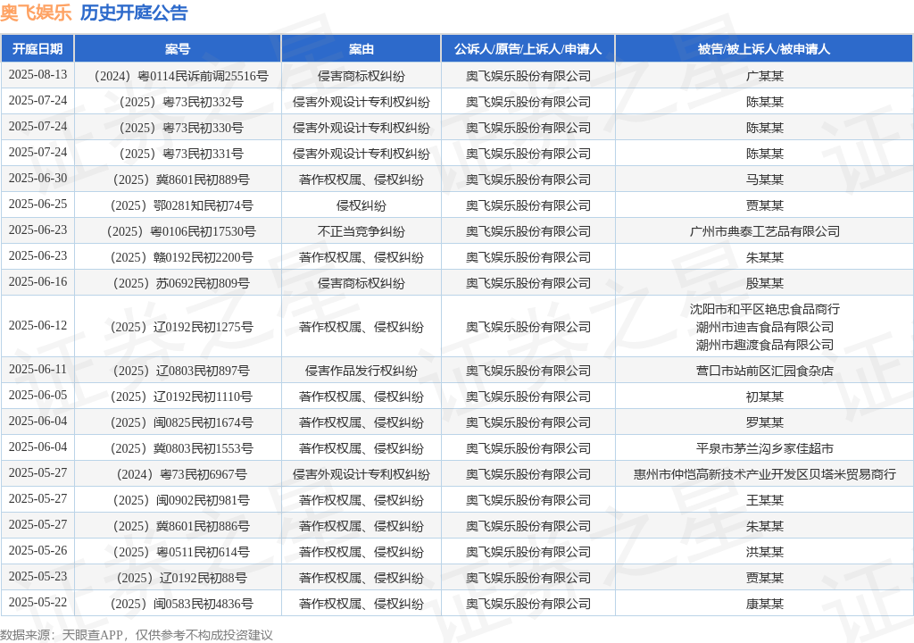 本站消息,根据天眼查APP显示,近日公布了一则奥飞娱乐股份有限公司作为原告/上诉人的开庭公告,详细内容如下: